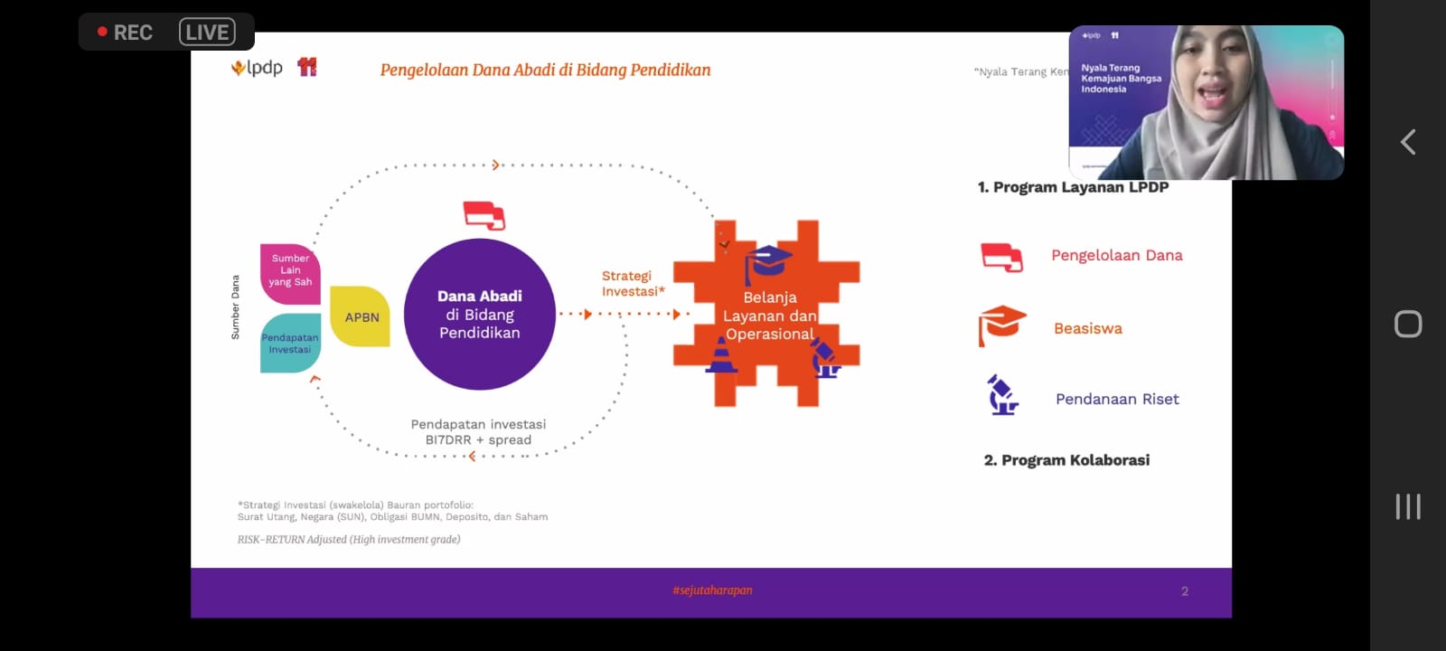 Acara webiner karirlab bersama Universitas Indonesia, Webiner UI CISE Scholarship Talk - LPDP: Meraih Pendidikan Terbaik Dunia yang Inklusif dengan Beasiswa LPDP Pembawa materi Berliana, Beasiswa LPDP institusi dibawah pemerintah beroprasi untuk dana abadi APBN diinvestasikan ke LPDP (pendaan beasiswa dan riset).